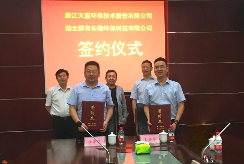 2019年6月20日,浙江天藍環保技術股份有限公司(以下簡稱“天藍環?!被颉拔宜尽保┖秃比河虚L物環保科技有限公司(以下簡稱“湖北群有”)戰略合作簽約暨天藍環保催化劑生產制造基地揭牌儀式在湖北省仙桃市瀏口工業園隆重舉行。湖北群有吳道君創始人、李軍營總經理,我司吳忠標創始人、王岳軍總工程師等領導參加儀式,標志著我司和湖北群有戰略合作翻開嶄新篇章。